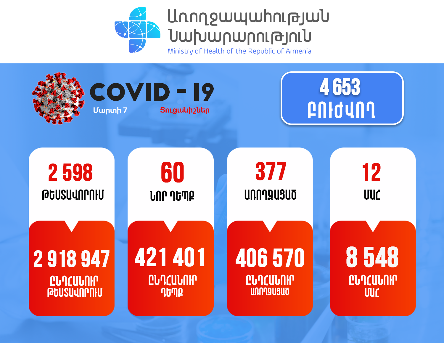 Այսպիսով, հաստատվել է կորոնավիրուսային հիվանդության ընդհանուր 421401 դեպք, որոնցից 406570 առողջացած: Փաստացի բուժում է ստանում 4653 պացիենտ: