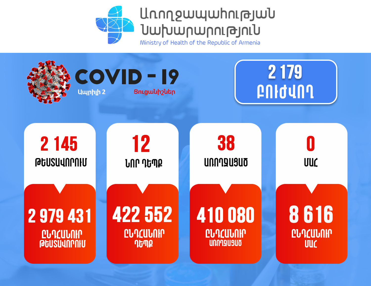 Այսպիսով, հաստատվել է կորոնավիրուսային հիվանդության ընդհանուր 422552 դեպք, որոնցից 410080 առողջացած: Փաստացի բուժում է ստանում 2179 պացիենտ: