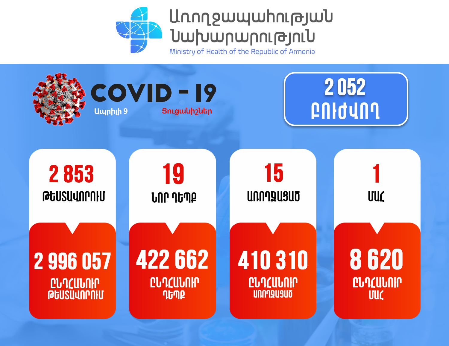Այսպիսով, հաստատվել է կորոնավիրուսային հիվանդության ընդհանուր 422662 դեպք, որոնցից 410310 առողջացած: Փաստացի բուժում է ստանում 2052 պացիենտ: