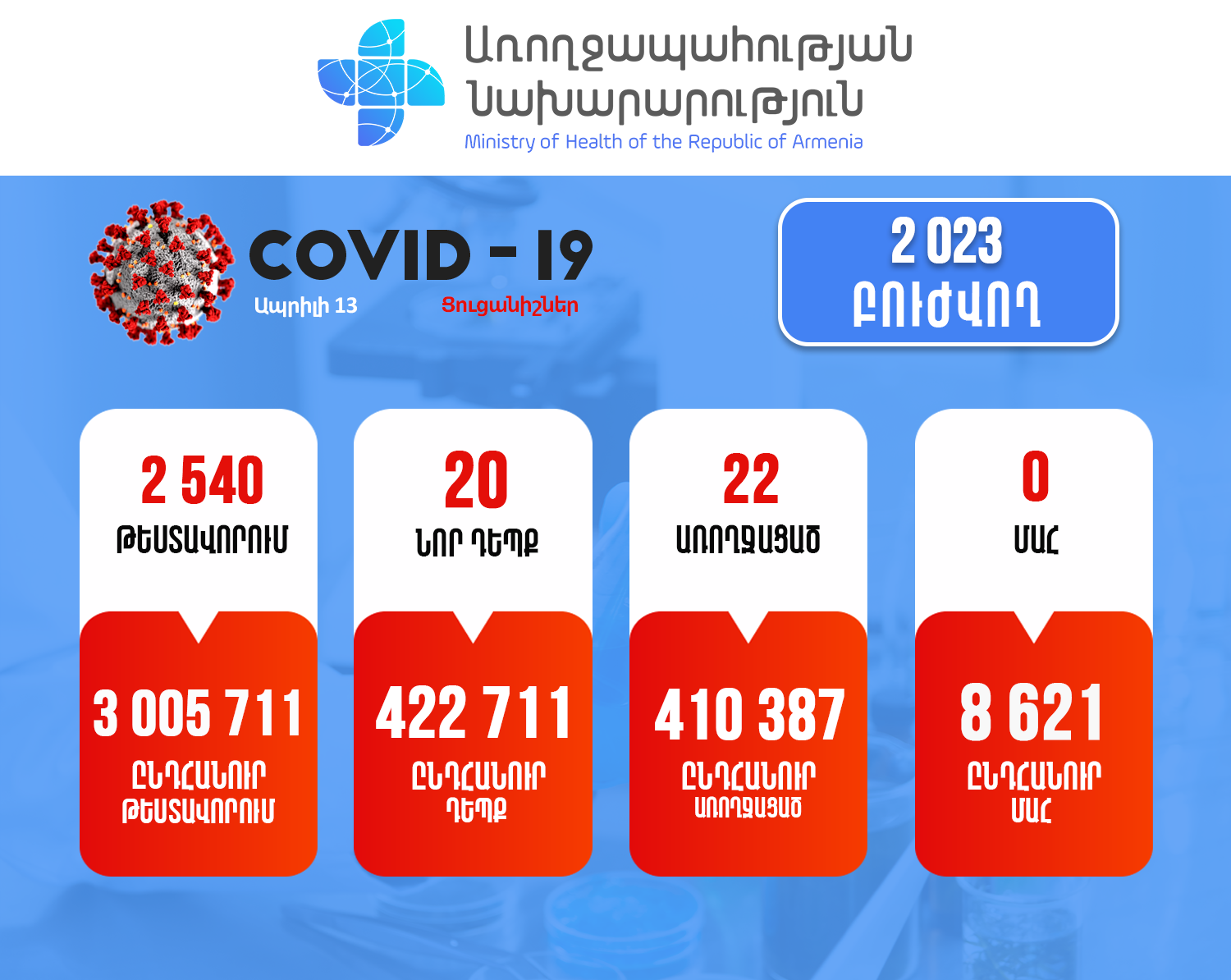 Այսպիսով, հաստատվել է կորոնավիրուսային հիվանդության ընդհանուր 422711 դեպք, որոնցից 410387 առողջացած: Փաստացի բուժում է ստանում 2023 պացիենտ: