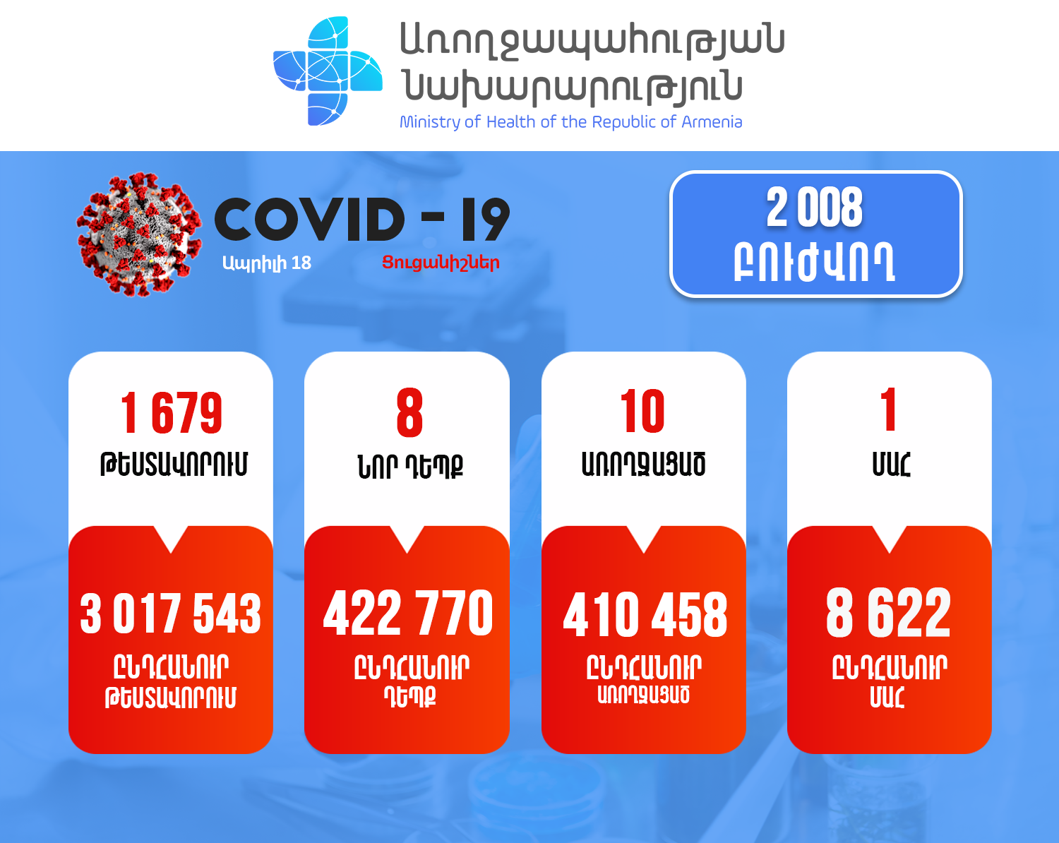 Այսպիսով, հաստատվել է կորոնավիրուսային հիվանդության ընդհանուր 422770 դեպք, որոնցից 410458 առողջացած: Փաստացի բուժում է ստանում 2008 պացիենտ: