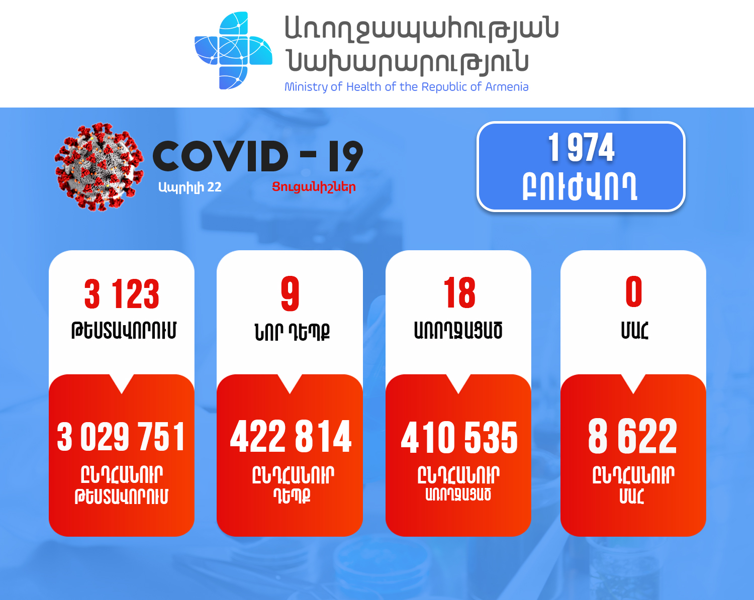 Այսպիսով, հաստատվել է կորոնավիրուսային հիվանդության ընդհանուր 422814 դեպք, որոնցից 410535 առողջացած: Փաստացի բուժում է ստանում 1974 պացիենտ: