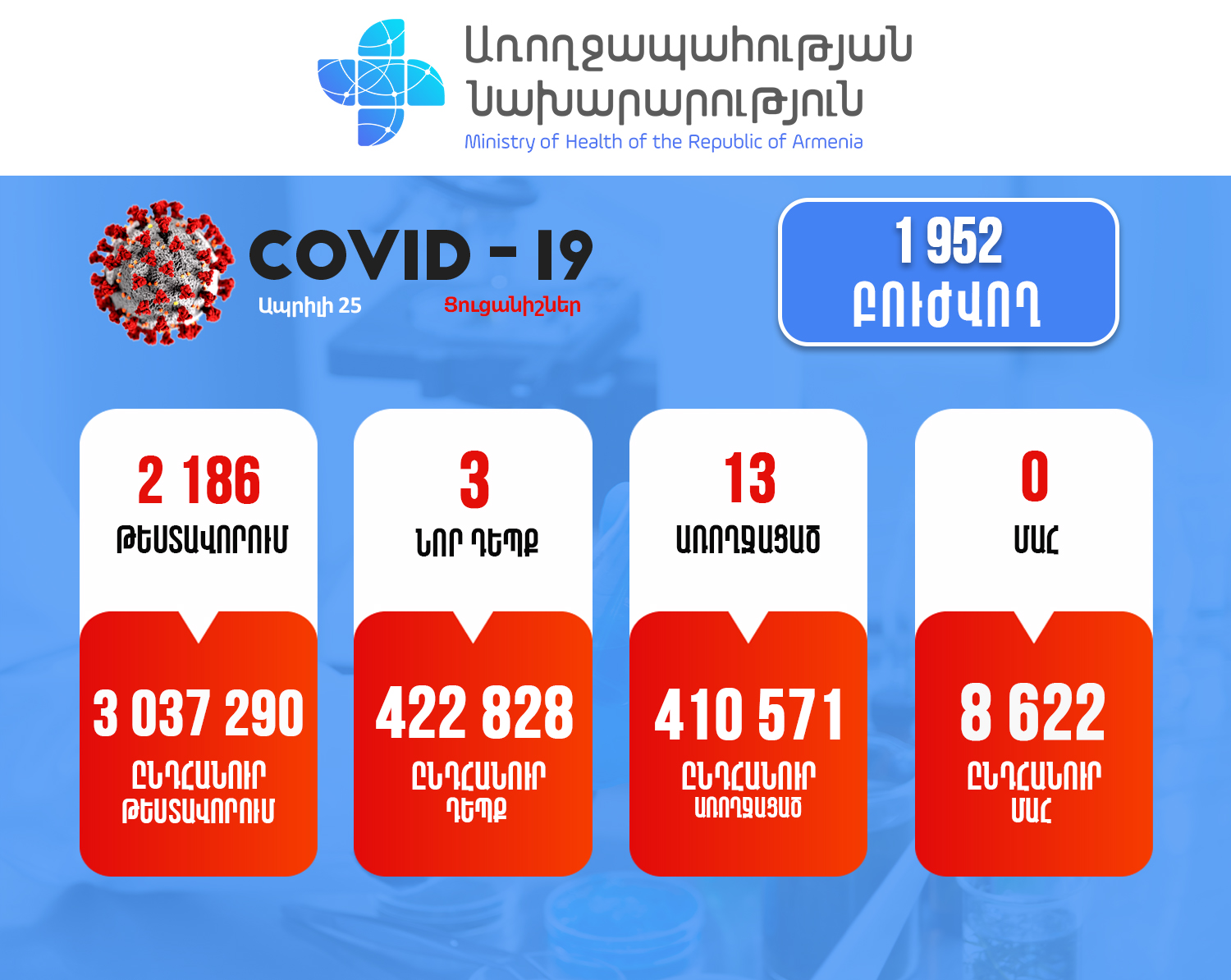 Այսպիսով, հաստատվել է կորոնավիրուսային հիվանդության ընդհանուր 422828 դեպք, որոնցից 410571 առողջացած: Փաստացի բուժում է ստանում 1952 պացիենտ: