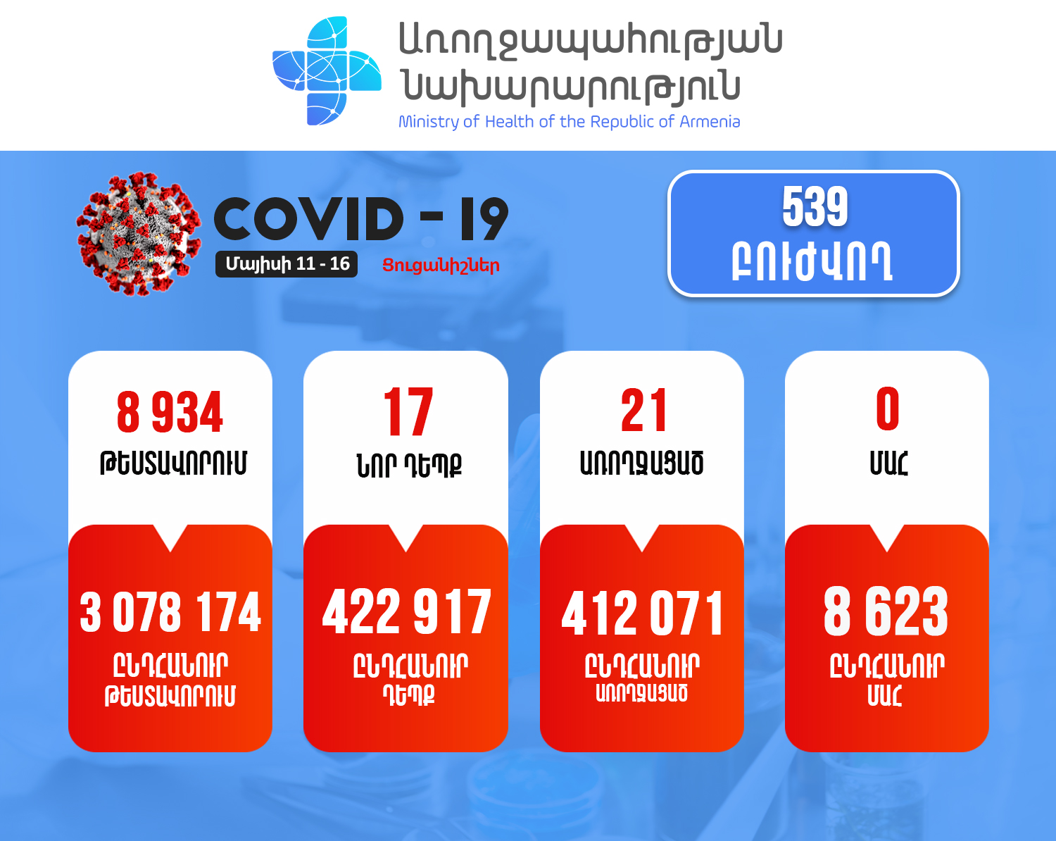 Այսպիսով, հաստատվել է կորոնավիրուսային հիվանդության ընդհանուր 422917 դեպք, որոնցից 412071 առողջացած: Փաստացի բուժում է ստանում 539 պացիենտ: