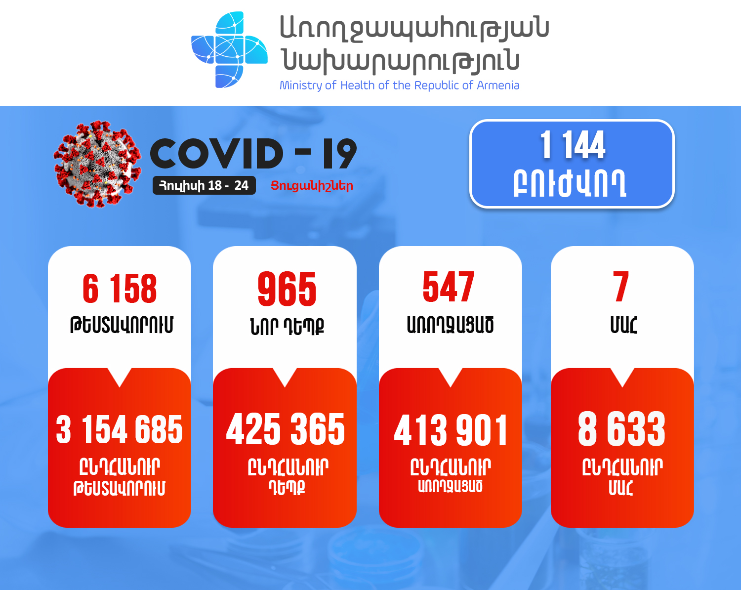 Այսպիսով, հաստատվել է կորոնավիրուսային հիվանդության ընդհանուր 425365 դեպք, որոնցից 413901 առողջացած: Փաստացի բուժում է ստանում 1144 պացիենտ: