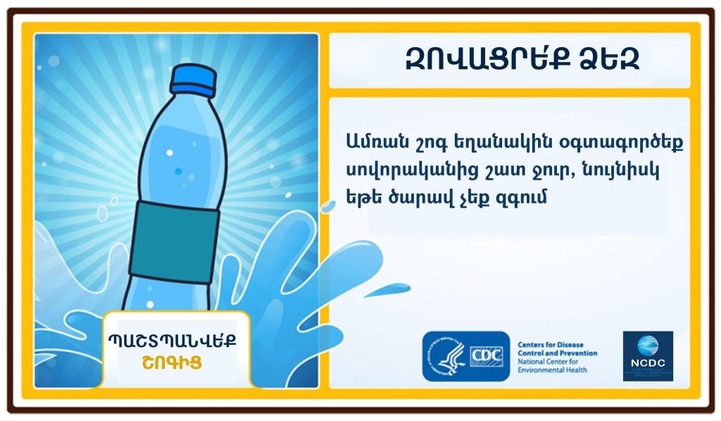 Ամռան շոգ եղանակին Օգտագործե՛ք սովորականից շատ հեղուկներ, նույնիսկ եթե ծարավ չեք զգում։