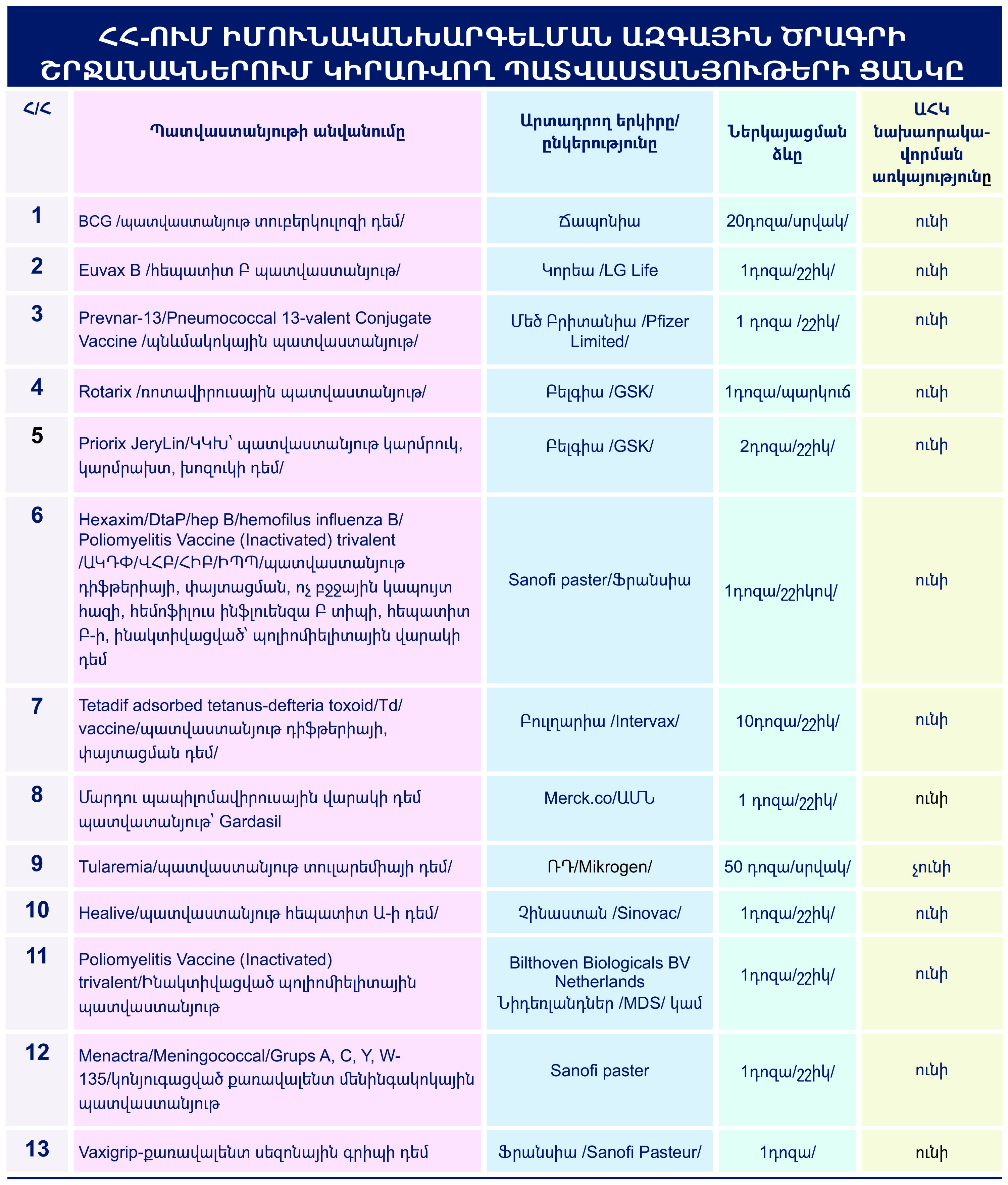 ՀՀ-ում իմունականխարգելման ազգային ծրագրի շրջանակում կիառվող պատվաստանյութերի ցանկ